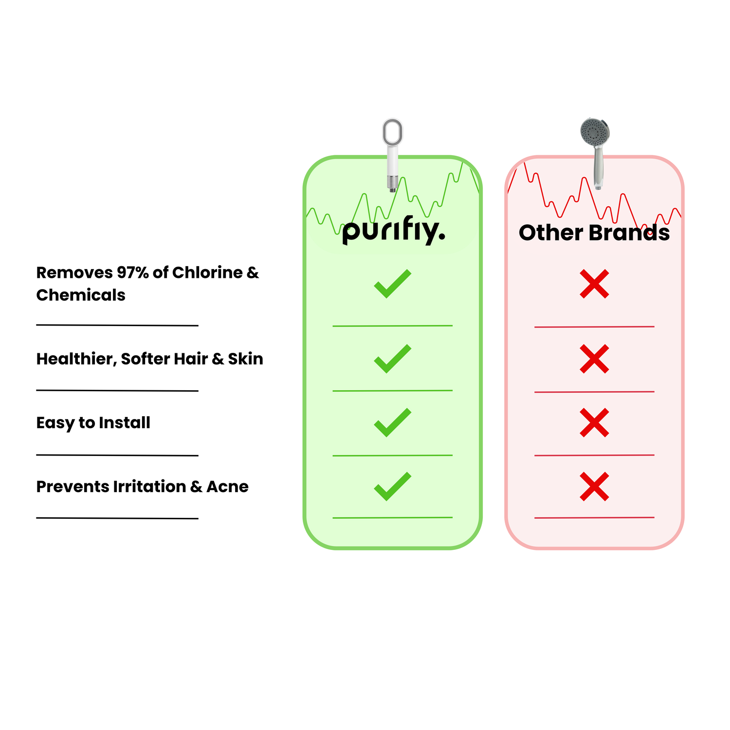 Purify fixes it at the source filtering chlorine, chemicals, and impurities so your shower becomes pure, gentle, and beauty-boosting every day.